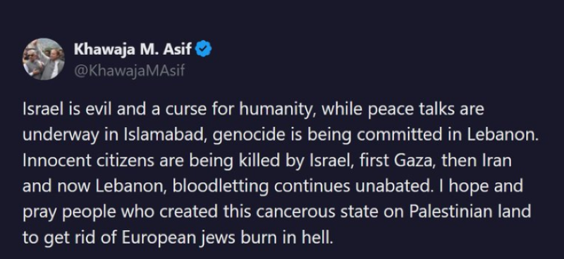 Pakistan Defence Minister’s call for Israel’s annihilation is outrageous. This is not a statement that can be tolerated from any government, especially not from one that claims to be a neutral arbiter for peace.