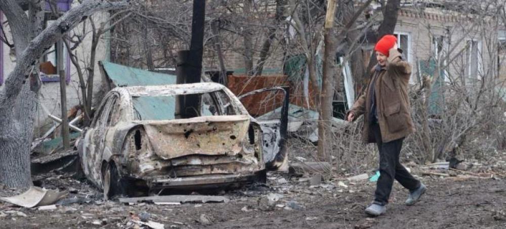 A woman walks past a burnt-out car and destroyed buildings in Kramatorsk, Ukraine.Photo: UNOCHA