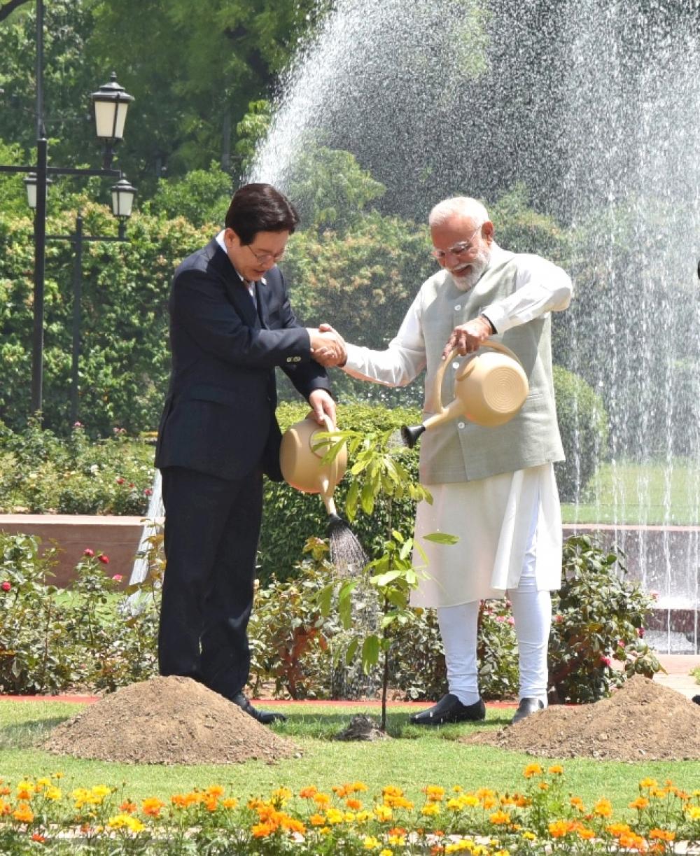South Korean President Lee Jae Myung planting a sapling at Hyderabad House, in New Delhi, on April 20 with Indian PM Narendra Modi. Photo: PIB