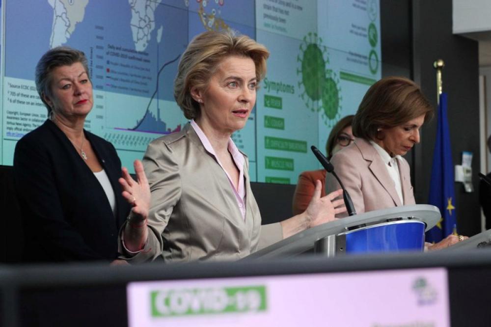 BRUSSELS, March 2, 2020 (Xinhua) -- European Commission President Ursula von der Leyen (C) speaks at a press conference on EUs response to COVID-19 at the EU Emergency Response Coordination Centre in Brussels, Belgium, March 2, 2020. The risk for people living or travelling in Europe to be infected with the COVID-19 has been leveled up by the European Center for Disease Prevention Control (ECDC), Ursula von der Leyen announced on Monday.