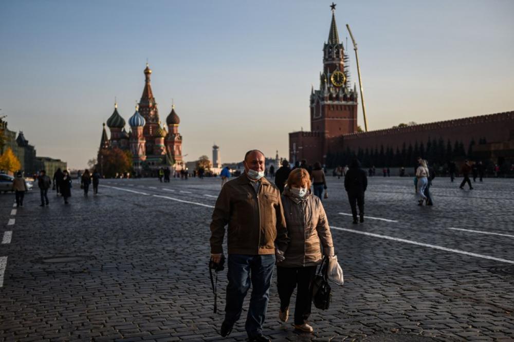 MOSCOW, Oct. 29, 2020 (Xinhua) -- Pedestrians wearing protective masks pass by the Red Square in Moscow, Russia, Oct. 28, 2020. Russia registered 16,202 new COVID-19 cases over the last 24 hours, down from the all-time daily record of 17,347 reported on Monday, the countrys COVID-19 response center said Wednesday.